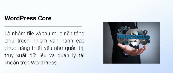 WordPress Core là tập hợp các file và thư mục nền tảng chịu trách nhiệm điều khiển toàn bộ hệ thống WordPress, bao gồm quản lý dữ liệu, người dùng, giao diện trang quản trị và nhiều thao tác quan trọng khác.